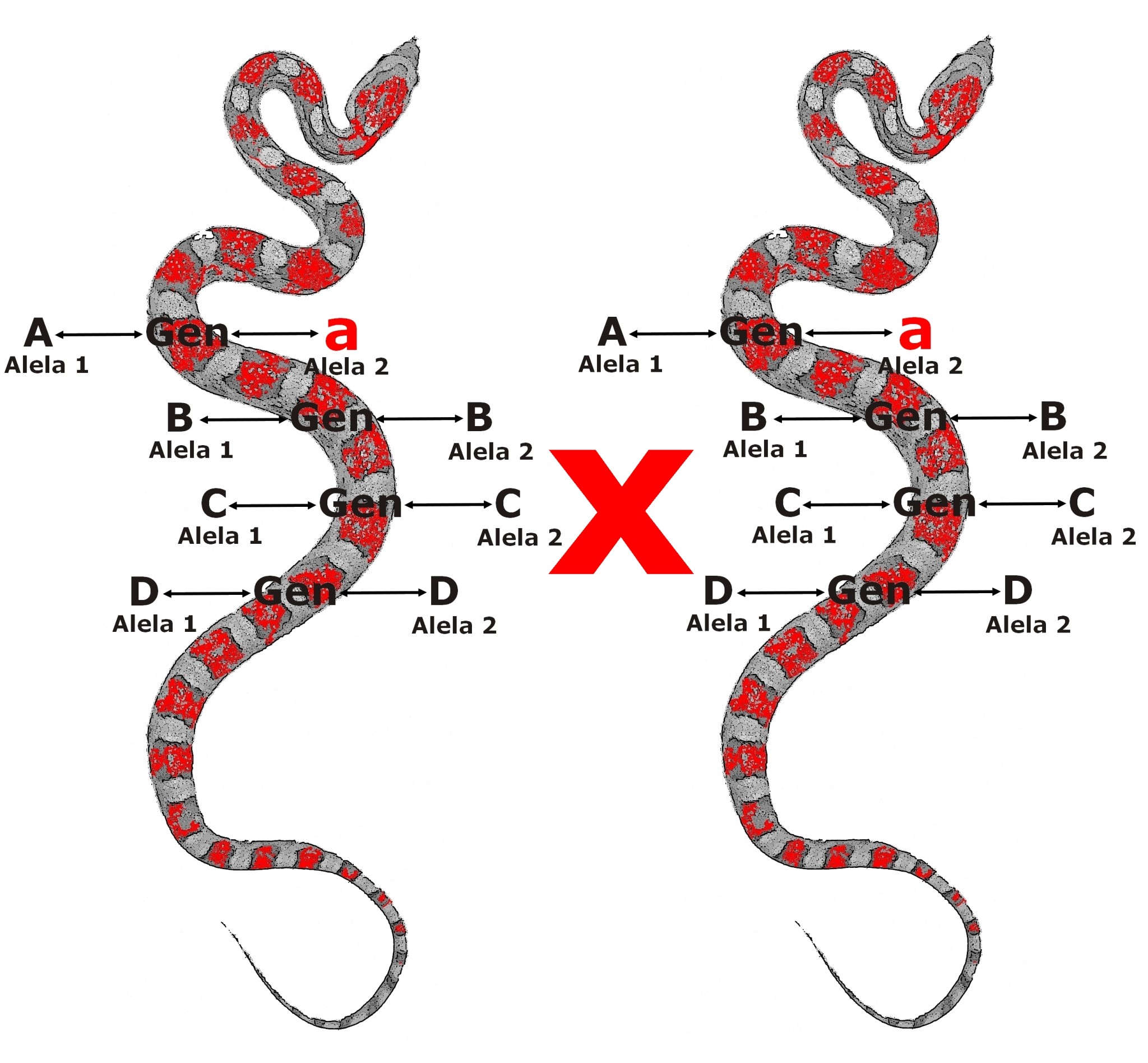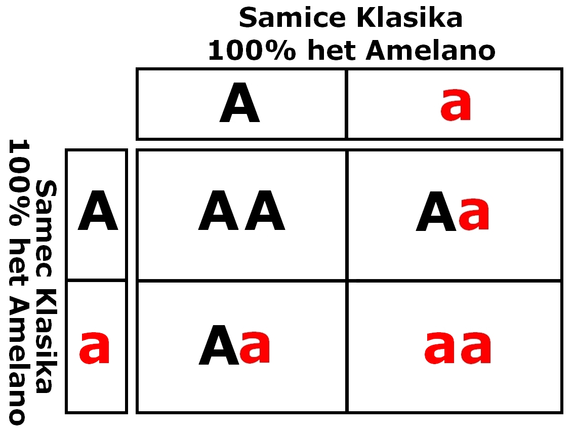 Na předešlé stránce jsme se dozvěděli co se stane, když zkřížíme Klasicky zbarvenou užovku s Amelanickou užovkou. Mláďata z takového páření jsou všechny Klasicky zbarvené, ale genotyp těchto zvířat už je "Aa". To znamená, že tato háďata jsou štěpitelné na formu Amelano. Jsou to 100% heterozygoti na formu Amelanistic. V případě, že by jsme se rozhodli pářit tyto hady mezi sebou, tak by to vypadalo takto.